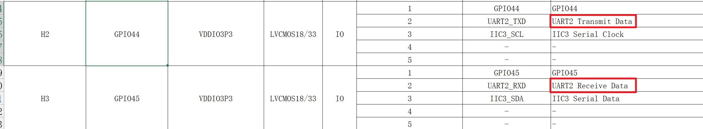 在开始前我们需要知道使用哪两个引脚作为UART引脚,假设使用GPIO44作为UART2 TX、GPIO45作为UART2 RX。
