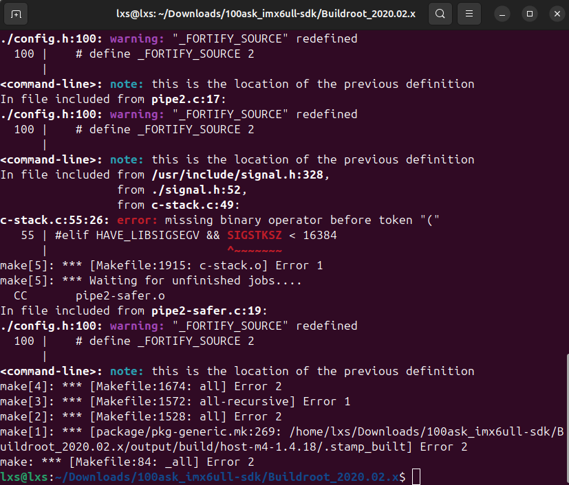 本人使用的环境是ubuntu24LTS,在我的尝试下,4.9.88版本内核可以经过简单的修改后编译通过。但是韦老师提供的buildroot2020版本实在是无法编译通过,在AI帮助下多次增加补丁也无济于事。报错如下(见图1):