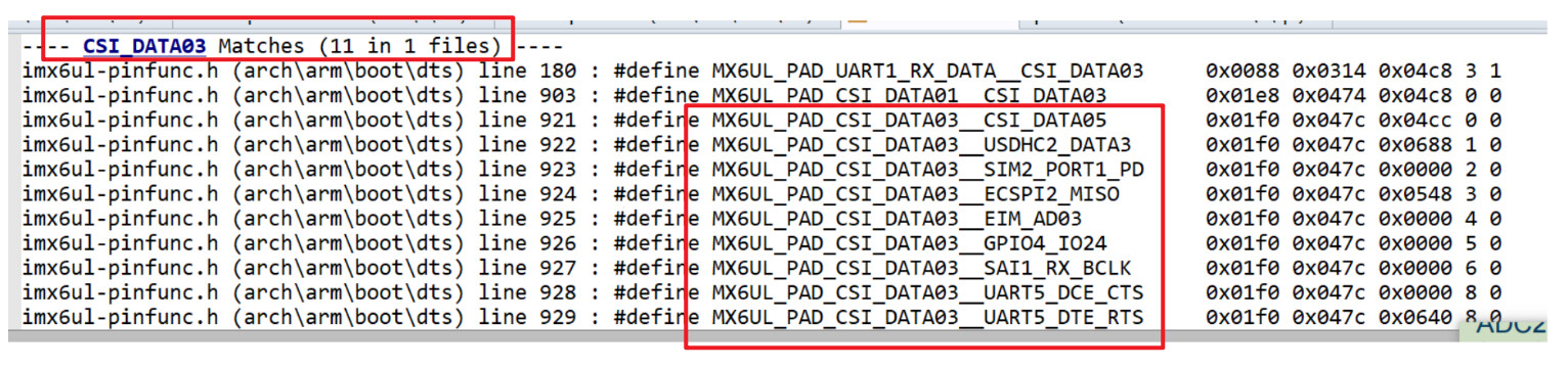 上述为底板和通用模块转接板,可以看到这里的SPICS1使用的是CSI_DATA3,在Linux-4.9.88\arch\arm\boot\dts\imx6ul-pinfunc.h也就是pinctrl头文件中搜索这里的CSI_DATA3