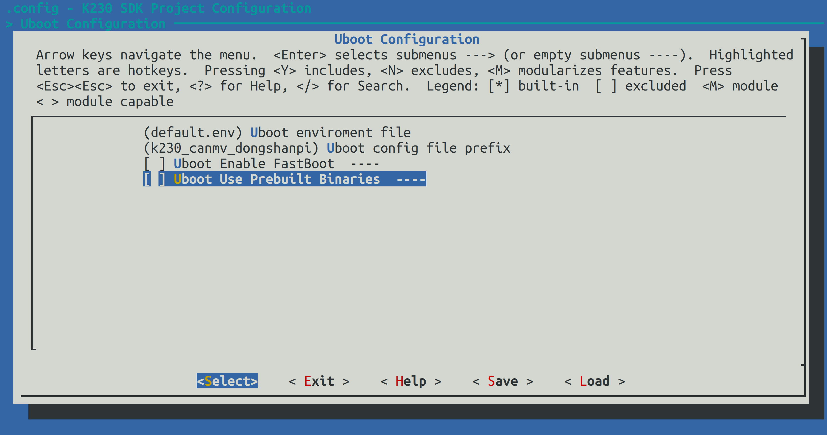 Save保存完后,退出uboot配置界面。保存uboot配置: